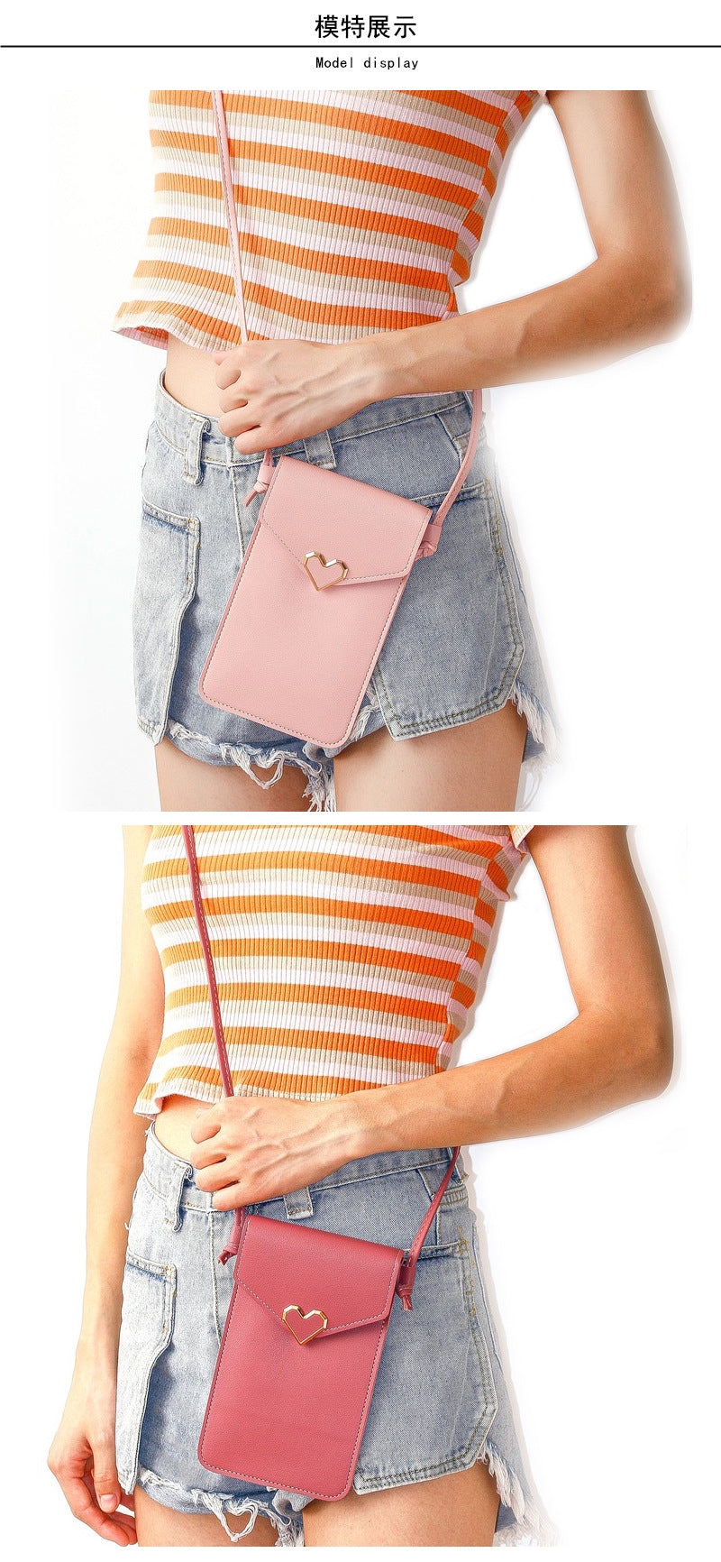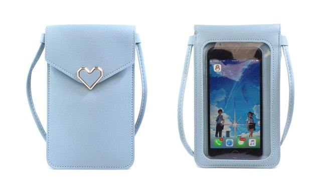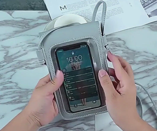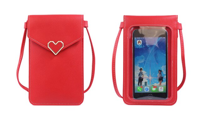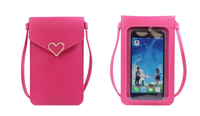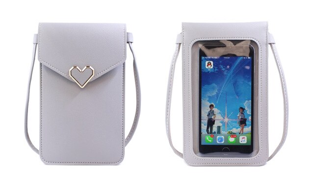 Carteira fabricada em couro e com ecrã apropriado para o manuseamento do telemóvel sem o retirar da bolsa.