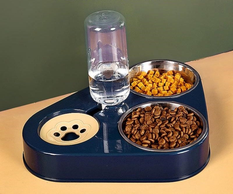 Com dispensador automático de água e duas tigelas para comida.